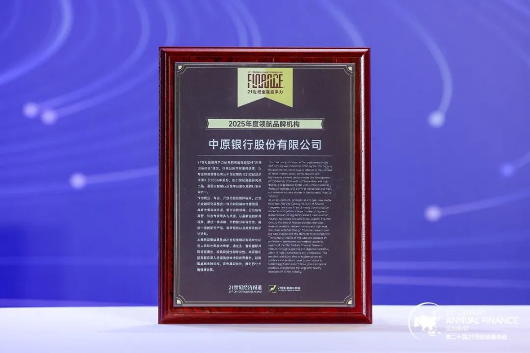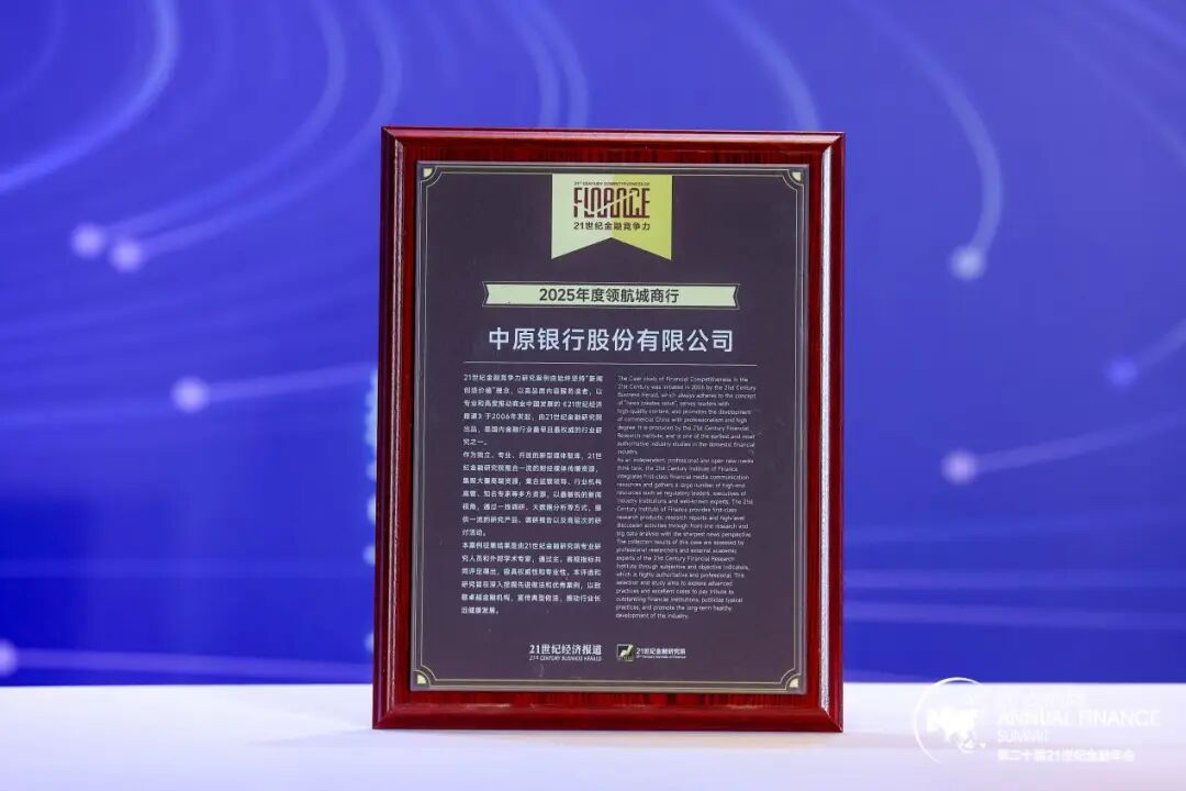 ??11月22日,在《21世紀經濟報道》主辦的“第二十屆21世紀金融年會”上,2025年21世紀金融競爭力研究案例正式揭曉。中原銀行獲“2025年度領航城商行”“2025年度領航品牌機構”兩項榮譽稱號。